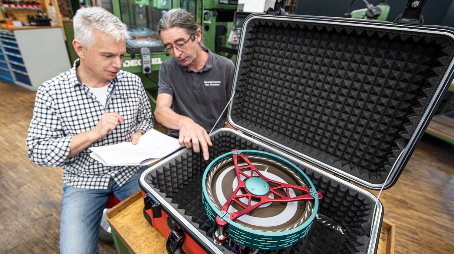 © Inka Reiter/Universität KonstanzThe gyro case is used in physics experiments to demonstrate different phenomena related to angular momentum. In the picture, electrician Thomas Trenker and toolmaker Ingmar Jäger discuss the controls for the brushless motor and the corresponding mechanical transfer to the fly wheel in the gyro case.