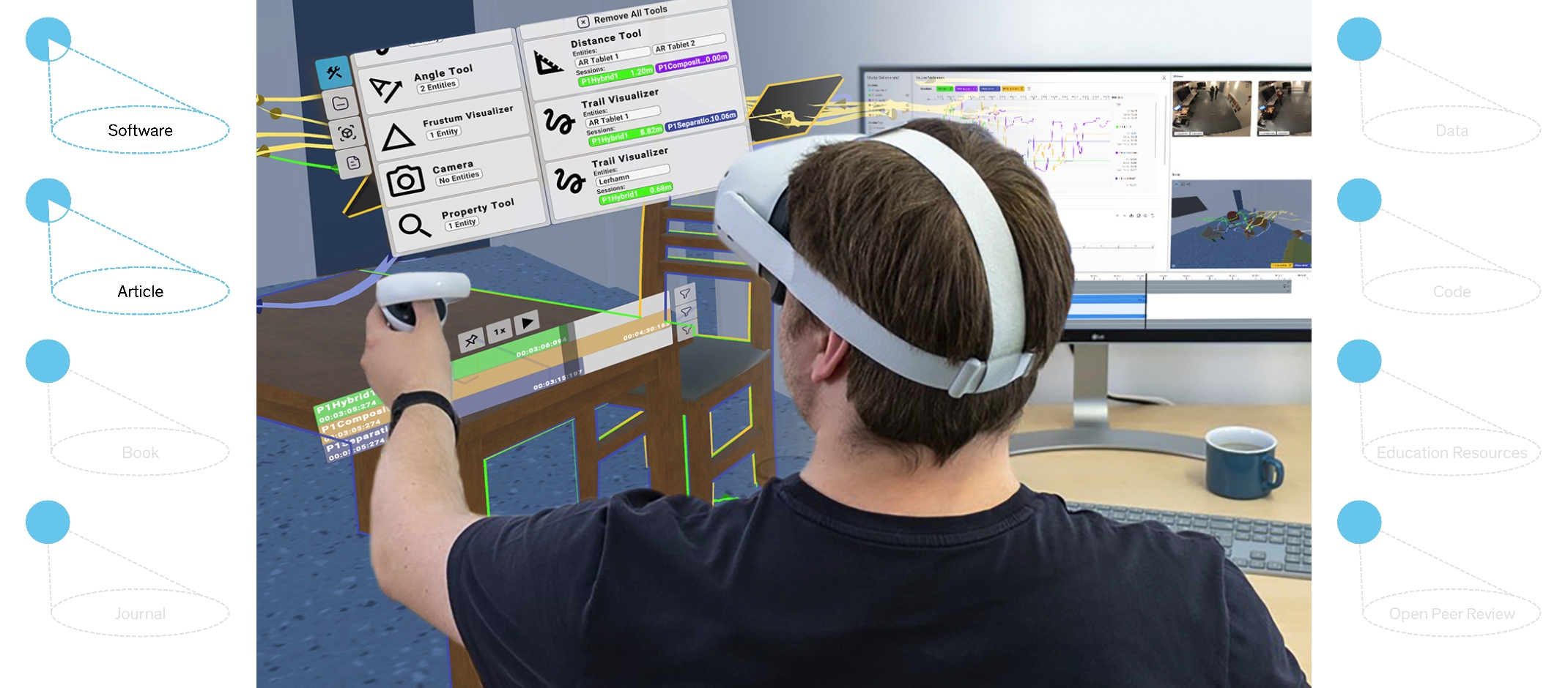 For this purpose, various tools are used to evaluate data either directly in virtual reality or traditionally on the desktop. The team led by Harald Reiterer, professor of human-computer interaction at the University of Konstanz, has now developed a toolbox that combines both options and makes the synchronized evaluation of mixed reality studies in VR and on the desktop possible. The toolbox as well as the accompanying publication (open access article) are freely available.