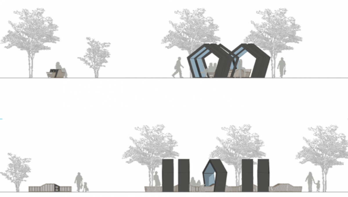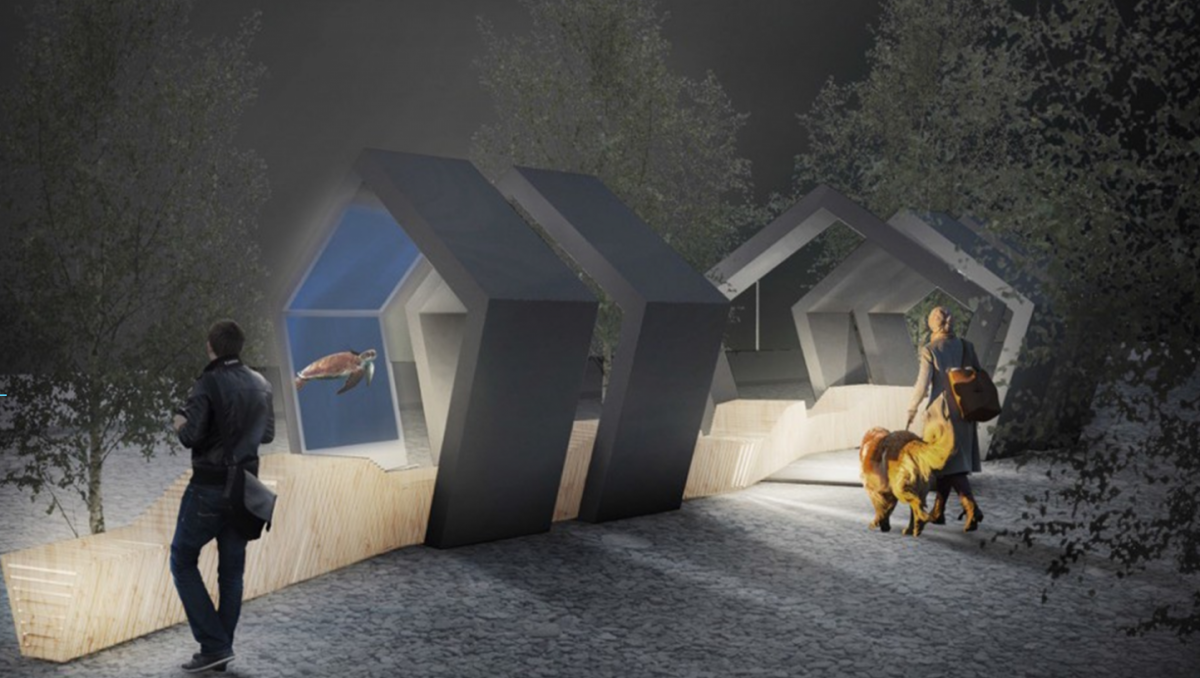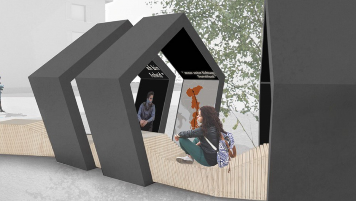 The pentagons are positioned so that the space between them is demonstrably open. They include flatscreens and interactive elements visualizing different current topics and content from the university and the HTWG’s portfolios. “We wanted to create a place that fits in well with its surroundings and invites passersby to explore it”, says the “5x5” team. Visitors can rest on the bench and take in the surrounding nature, city life or panoramic view, (depending on the current location), while also having the opportunity to dive into the world of science and research. Whether they take a quick glance or plumb the depths, visitors decide for themselves.