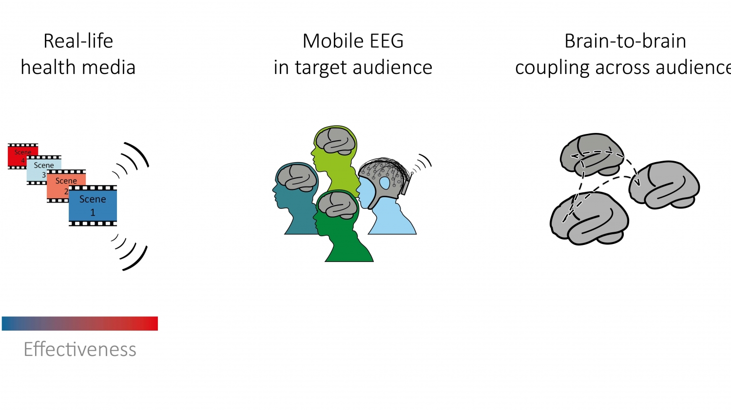 Both studies were important for illustrating the potential of the inter-subject correlation approach to assess how an audience receives health messages. But by using fMRI, they were limited in two ways. First, fMRI has low temporal resolution, which means that data on brain activity is collected about every two seconds. In dynamic media stimuli, where two seconds can be the difference between a love scene and a crime scene, this means that crucial information can be lost. Second, MRI scanners are large devices that produce a strong magnetic field to function properly, so using them is generally restricted to single participants in a laboratory.