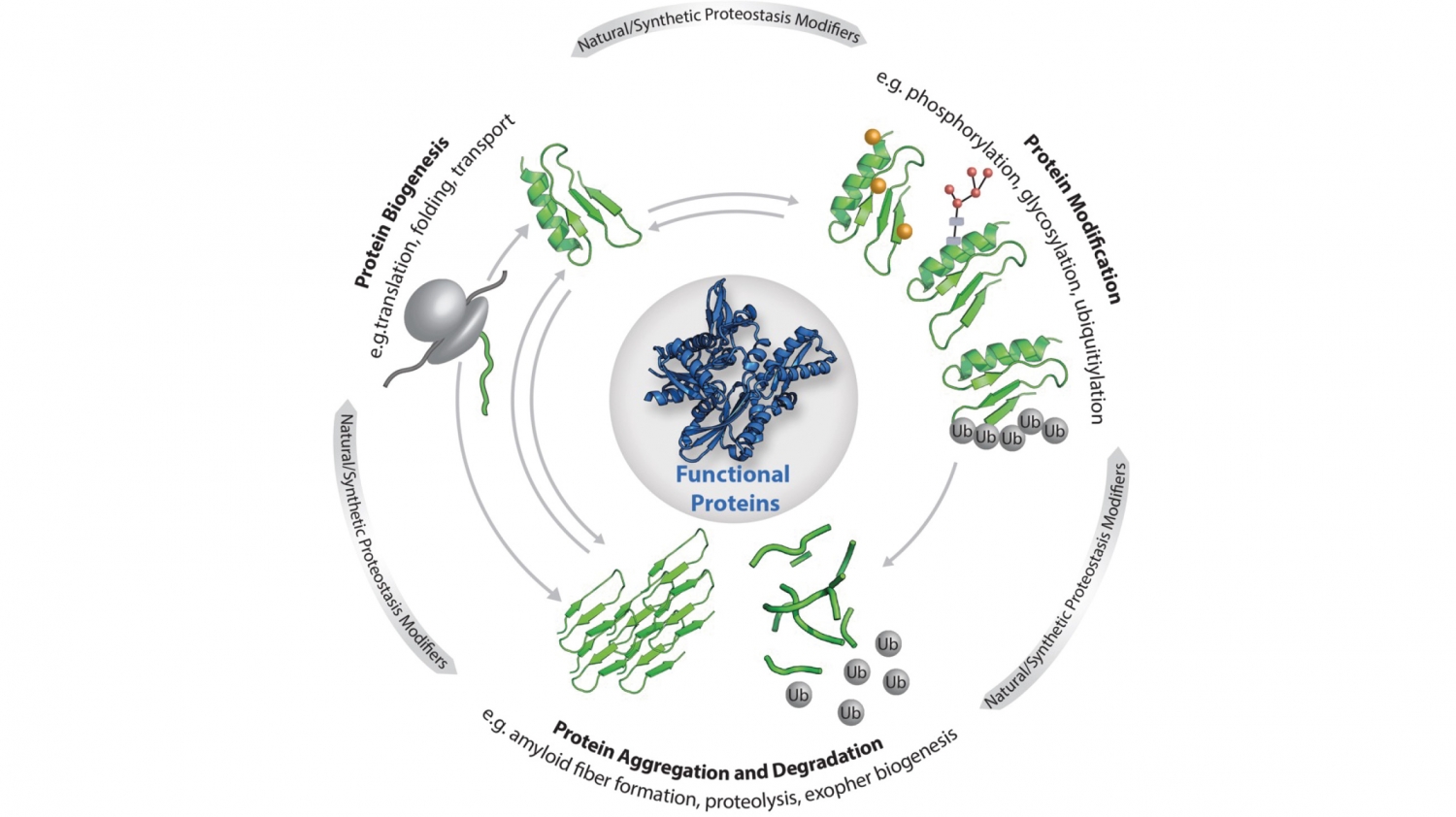 © Elke DeuerlingCellular proteostasis: The functionality of the individual proteins that make up the proteome is regulated by the central processes as shown (biogenesis, modification, degradation and aggregation). Proteostasis is also influenced by stress, ageing, metabolites as well as custom-made ligands, small molecules and artificial protein modifications.