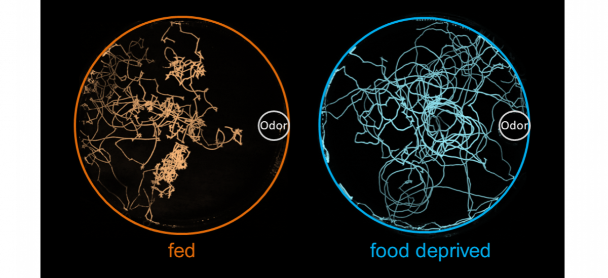 In the framework of her most recent study, which has just appeared in the journal Science Advances and originates from her time as a post-doctoral researcher at Harvard, Katrin Vogt and her colleagues have examined how hunger influences the behaviour of vinegar flies and what exactly happens in the animals’ brains in the process. The idea for this came to her while looking at the “wiring diagram” of the vinegar fly’s brain. “Looking at the connectivity pattern of the nerve cells in the first olfactory centre of the fly larva, known as the antennal lobe, we presumed that there must be at least two different states of activity in the olfactory system. We wanted to know what causes the transition between these two states of activity and arrived at hunger as a possibility,” explains Katrin Vogt. As it turned out, she and her fellow researchers evidently had a good nose.
