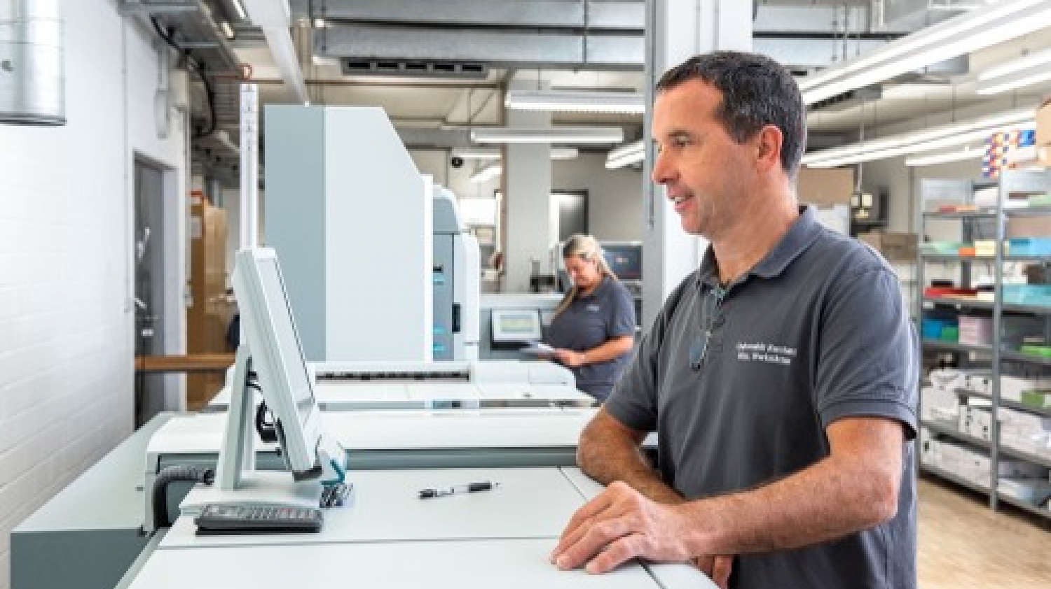 Andreas Steinebrunner from WWA checks a print job using the display for the black-and-white printing line. In the background, Sara Ricci picks up stapled DIN A5 brochures and checks the quality of the print and the accuracy of the folds.