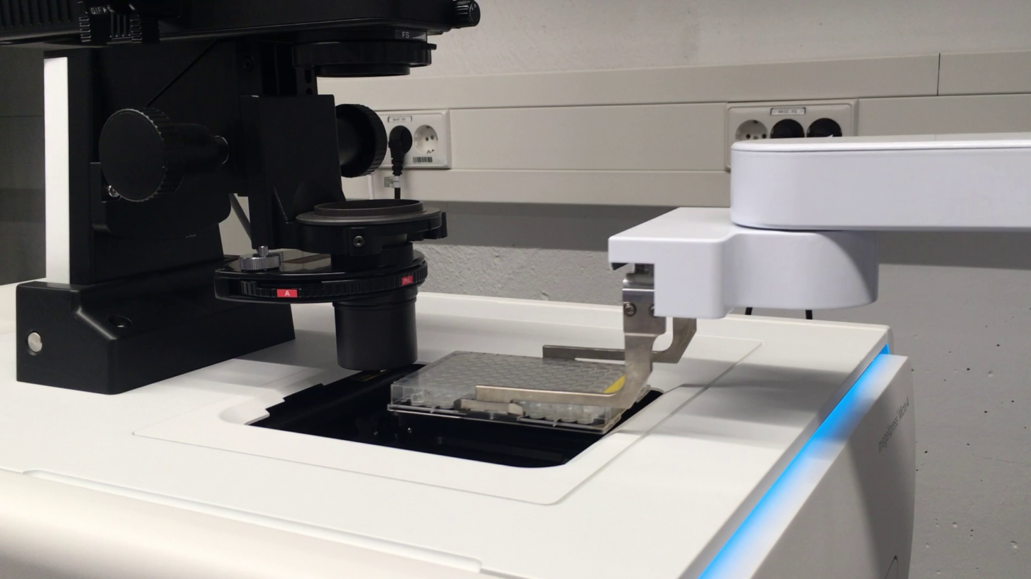 © AG Becks, Universität KonstanzEin Roboterarm transportiert Proben zur Analyse zum Hochdurchsatz-Mikroskop der AG Becks.