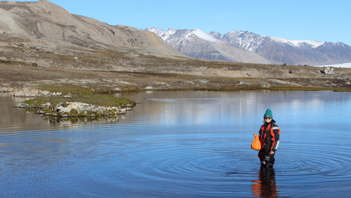 Die AWIPEV-Forschungsbasis in Ny-Ålesund ist eine kleine Ansammlung von Häusern in skandinavischer Bauweise, direkt am Meer gelegen. Im Hintergrund türmen sich Berge auf. Jeden Tag bricht Eva Riehle nach dem Frühstück auf, legt zu Fuß vier bis fünf Stunden zurück, um Proben von Cyanobakterien zu sammeln, kommt erst abends zurück. „Bevor man die Station verlässt, muss man in einem Online-Buchungssystem eintragen, dass man weggeht, wie lange man unterwegs ist, welche Route man geht und was man macht,“ sagt sie und fügt hinzu: „Man muss eine Menge dabeihaben: ein Gewehr, die Munition, eine Schreckschusspistole, Munition dafür, ein Funkgerät und ein Satellitentelefon, weil das Funkgerät hinter dem Berg keinen Empfang mehr hat. Da hat man schnell einen 10-Kilo-schweren Rucksack beisammen.“