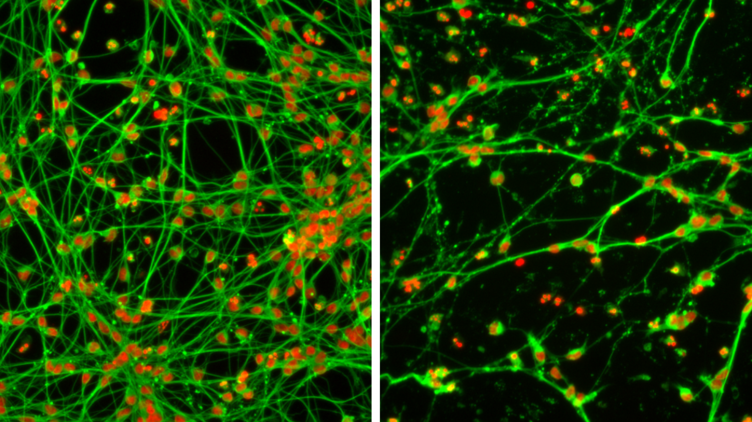 Nervenzellen gehen oft weitverzweigte Netzwerke untereinander ein (links). Neurotoxische Substanzen können unter anderem dazu führen, dass diese Vernetzung fehlerhaft oder gar nicht verläuft (rechts).