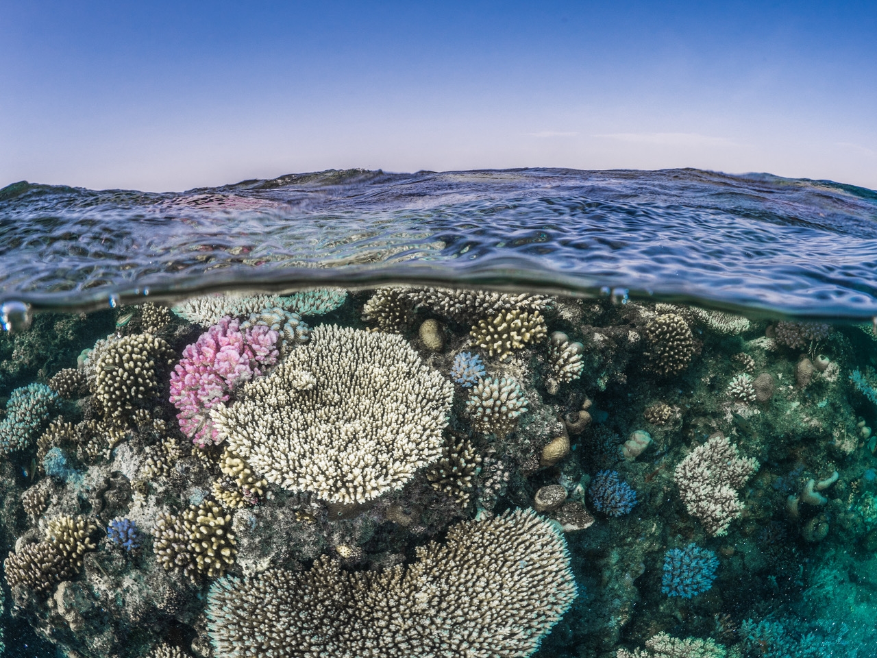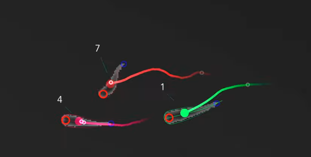 © AG Burkard | Schematische Darstellung des neuen Spin Qubits bestehend aus vier Elektronen (rot) mit ihren Spins (blau) in der umgebenden Halbleiterstruktur (grau).