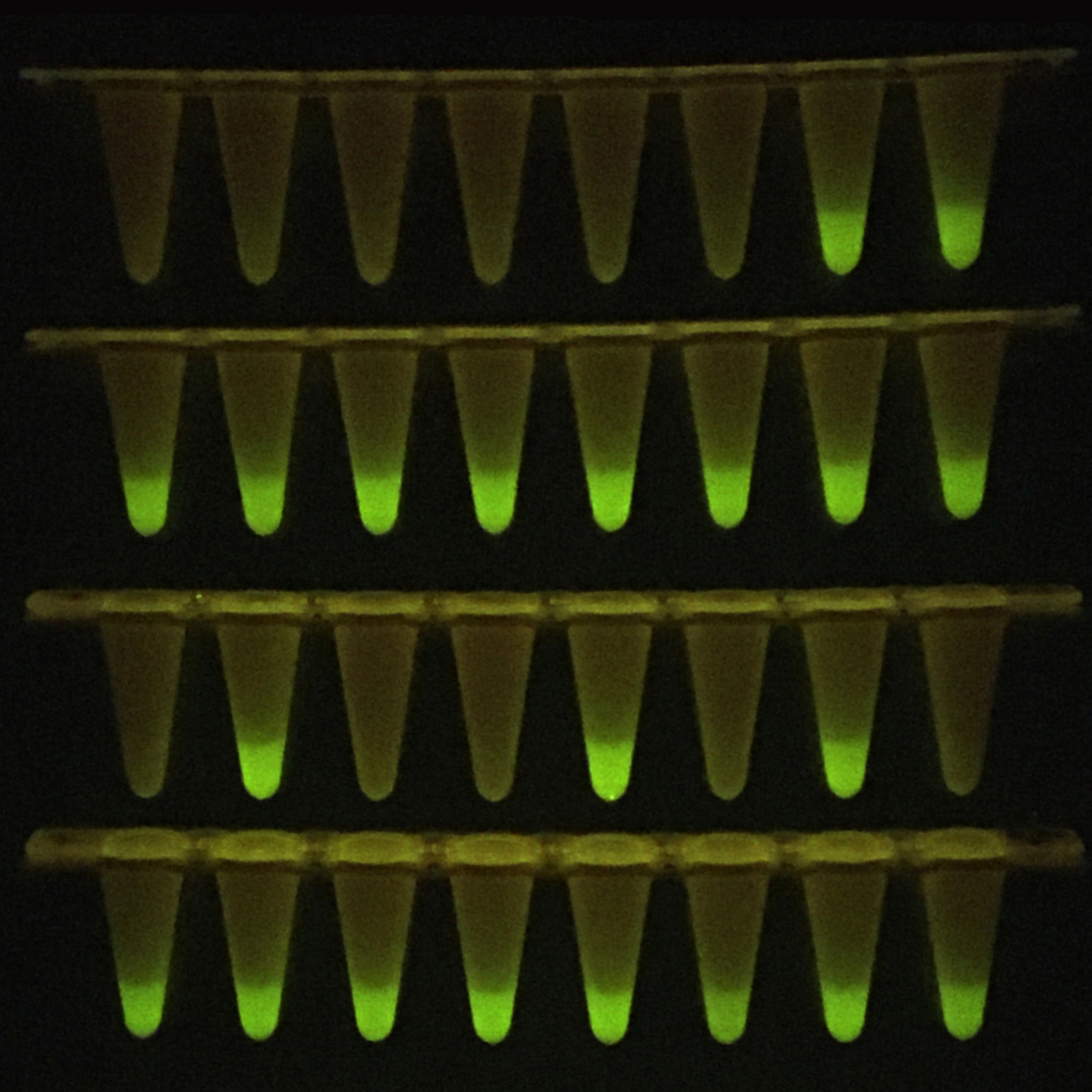 © Die vor einem LED-Schirm fluoreszierenden Proben zeigen die Anwesenheit von SARS-CoV-2 Virus-RNA an, die hier mittels des neuen Schnelltestverfahrens detektiert wurde. Bild: Universität Konstanz