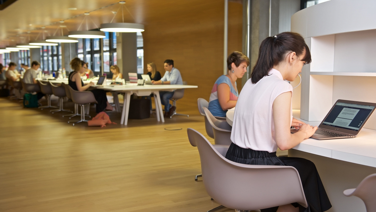 Wir verstehen unsere Bibliothek zwar auch als Ort für die Kollektion, vor allem aber als Lern- und Arbeitsraum für die Studierenden. Wenn Sie durch die Bibliothek laufen und die Studierenden fragen, werden viele sagen: „Natürlich ist die Bibliothek mein zweites Zuhause in der Prüfungszeit.“ Und dazu gehören auch Bereiche wie das BibCafé und verschiedenste Arbeitsplätze, an denen man reden, diskutieren und lachen darf.