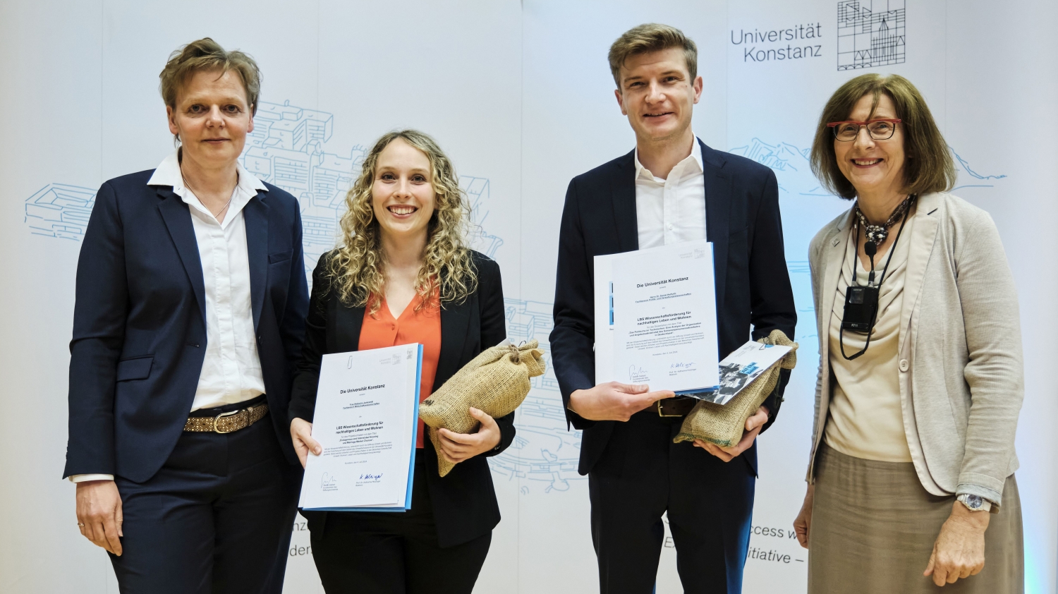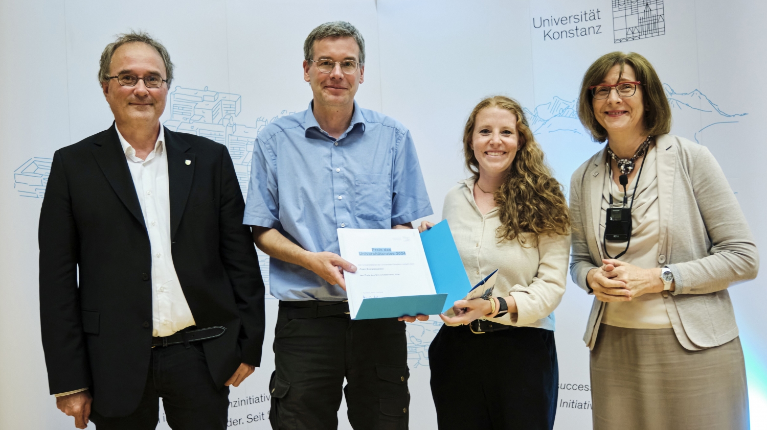 © Universität Konstanz, Philipp Uricherv.l.n.r: Marion May, Natascha Jankowski, Daniel Herfurth, Rektorin Katharina Holzinger