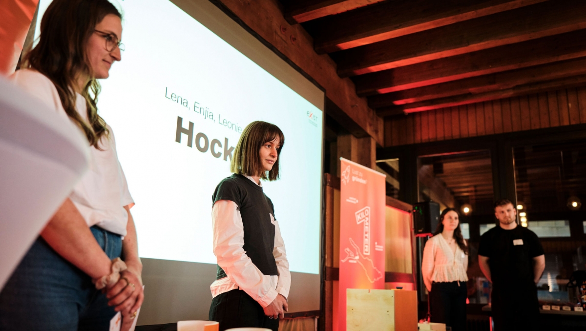 Es folgte das Team Hocker+ von Lena, Marvin, Leonie und Enjia der HTWG Konstanz. Ihre Idee: ein Hocker, der mehr kann, als nur ein Hocker zu sein: „Ein Hocker, aber unendlich viele Möglichkeiten“, sagte Lena. Schnell wurde klar, dass hier ein echtes Multitalent vorgestellt wurde. Mit insgesamt 15 Konfigurationsmöglichkeiten, nachhaltigen Materialien und cleveren Verbindern lässt sich das Möbelstück individuell anpassen. Die Jury und das Publikum waren von der Flexibilität begeistert.