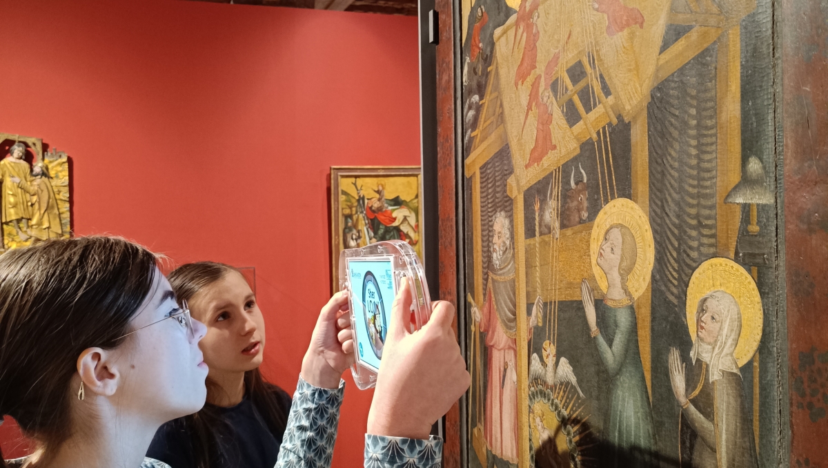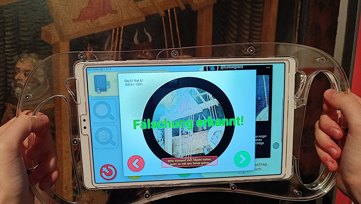 Auf knarrenden Dielen bewegen wir uns behutsam durch die altehrwürdigen Räume, immer auf den Spuren des jüngsten Kriminalfalls. Wir folgen den Fährten, die der arglistige Detaildieb hinterlassen hat. Hier eine verräterische Nachricht, da ein paar Fingerabdrücke, schließlich dort ein verdächtiges Kunstwerk. Mit bloßem Auge wären die Unterschiede zwischen Original und Fälschung nicht zu erkennen, aber unserer High-Tech-Lupe entgeht nichts. Ochs und Esel auf einem Altarbild der Geburt Christi erscheinen uns verdächtig. Wir halten die Lupe davor, scannen behutsam das Bild ab. Das Ergebnis ist eindeutig: „Fälschung erkannt!“, meldet die Lupe.