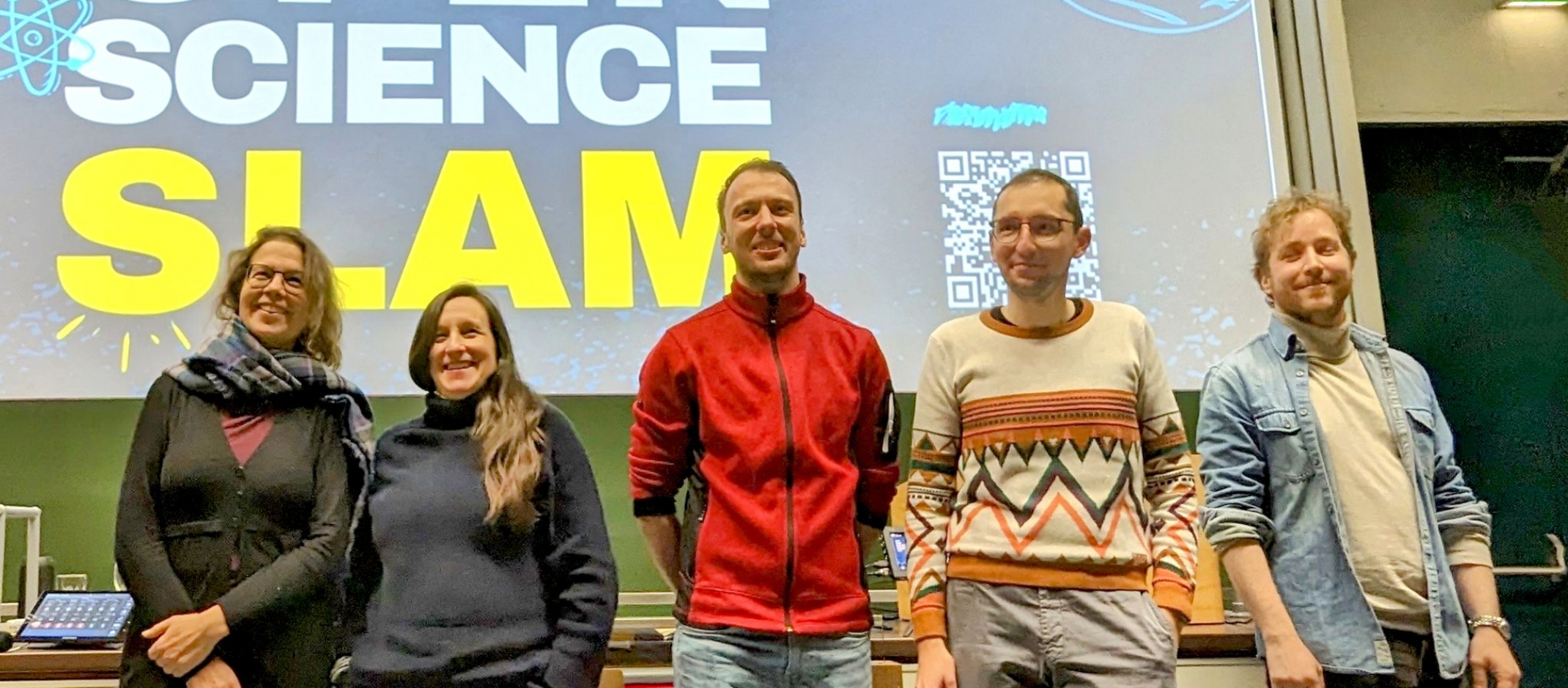 Am 17. Januar 2024 fand der erste „Open Science Slam“ der Universität Konstanz statt. Mit kreativen Kurzvorträgen gaben fünf Forschende leichtverständliche Einblicke in ihre Arbeit und gingen anschließend in einen regen Austausch mit dem gleichermaßen begeisterten wie diskussionsfreudigen Publikum. Gewinner des Slams: Physiker Thomas Bissinger, der mit der Geschichte der wissbegierigen Laura und einem beherzten Sprung auf das Rednerpult das Rennen für sich entschied.