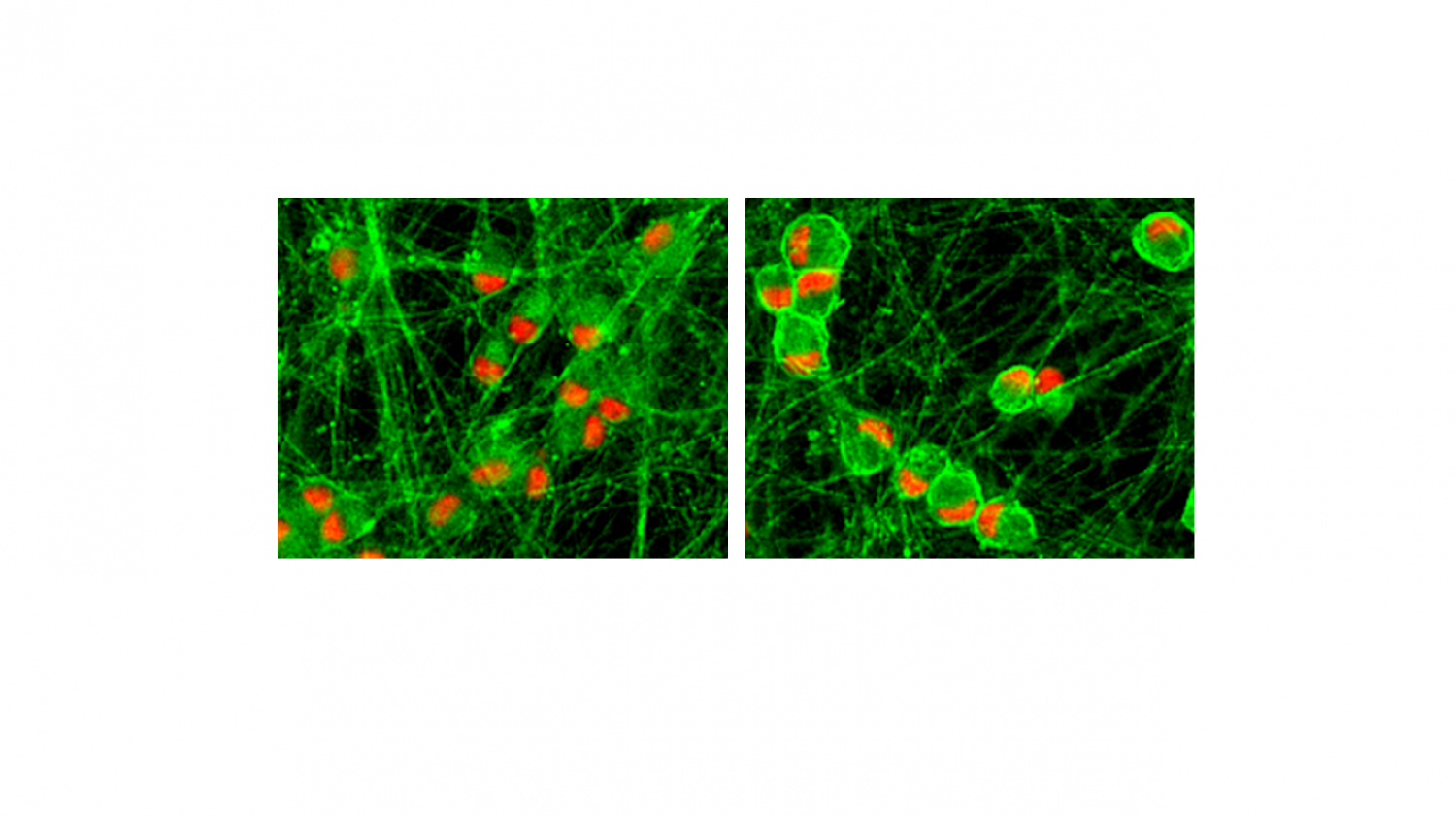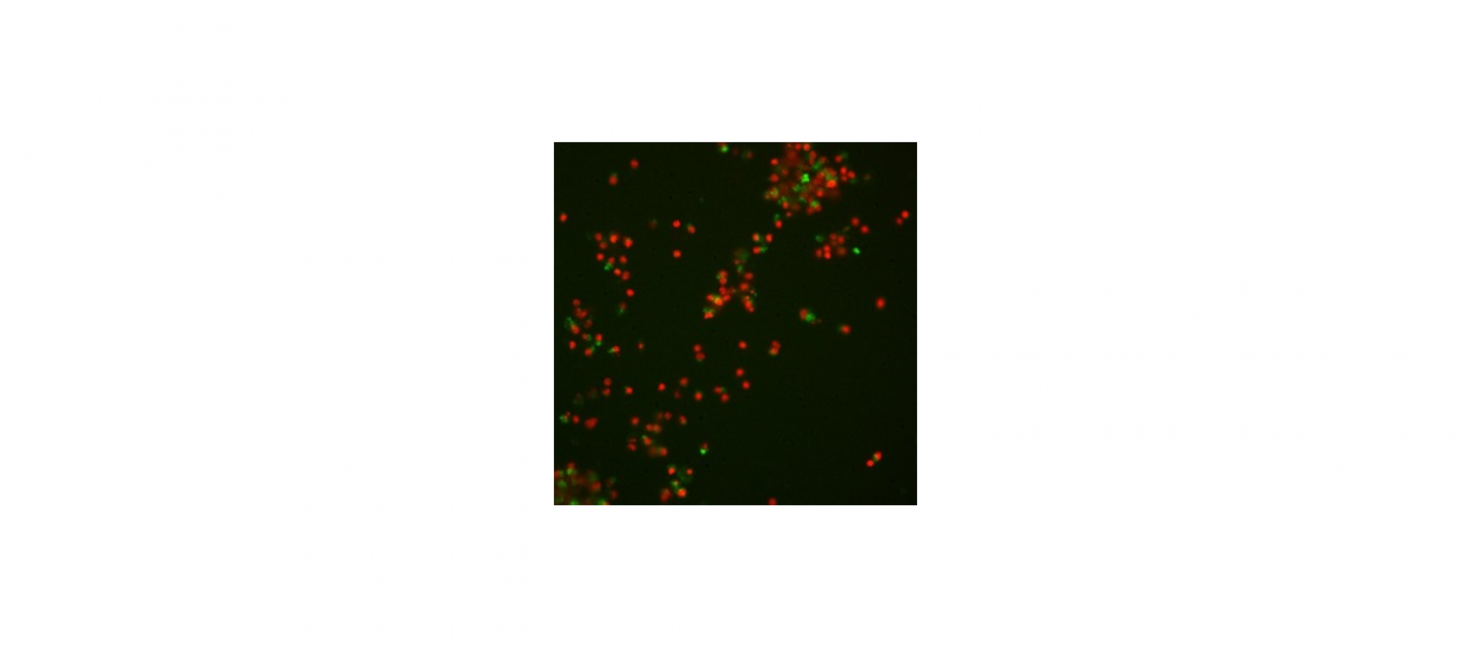 Links: Grün gefärbte Kontrollzellen mit rot gefärbtem Zellkern