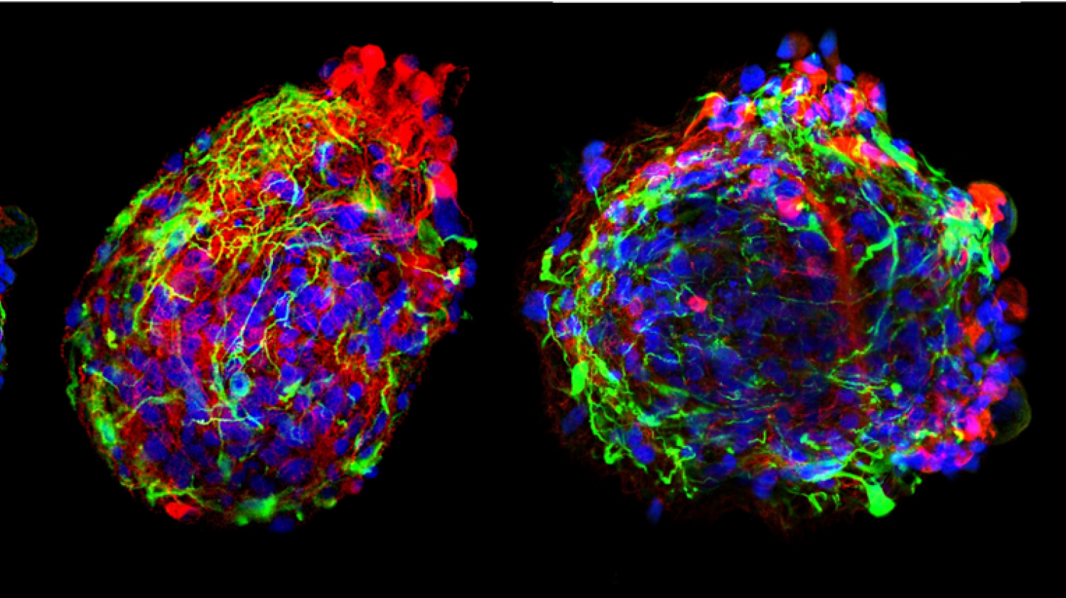 Menschliche „Minigehirne “ für die Zelltodforschung. Die Farben zeigen die verschiedenen Zelltypen in den Organoiden