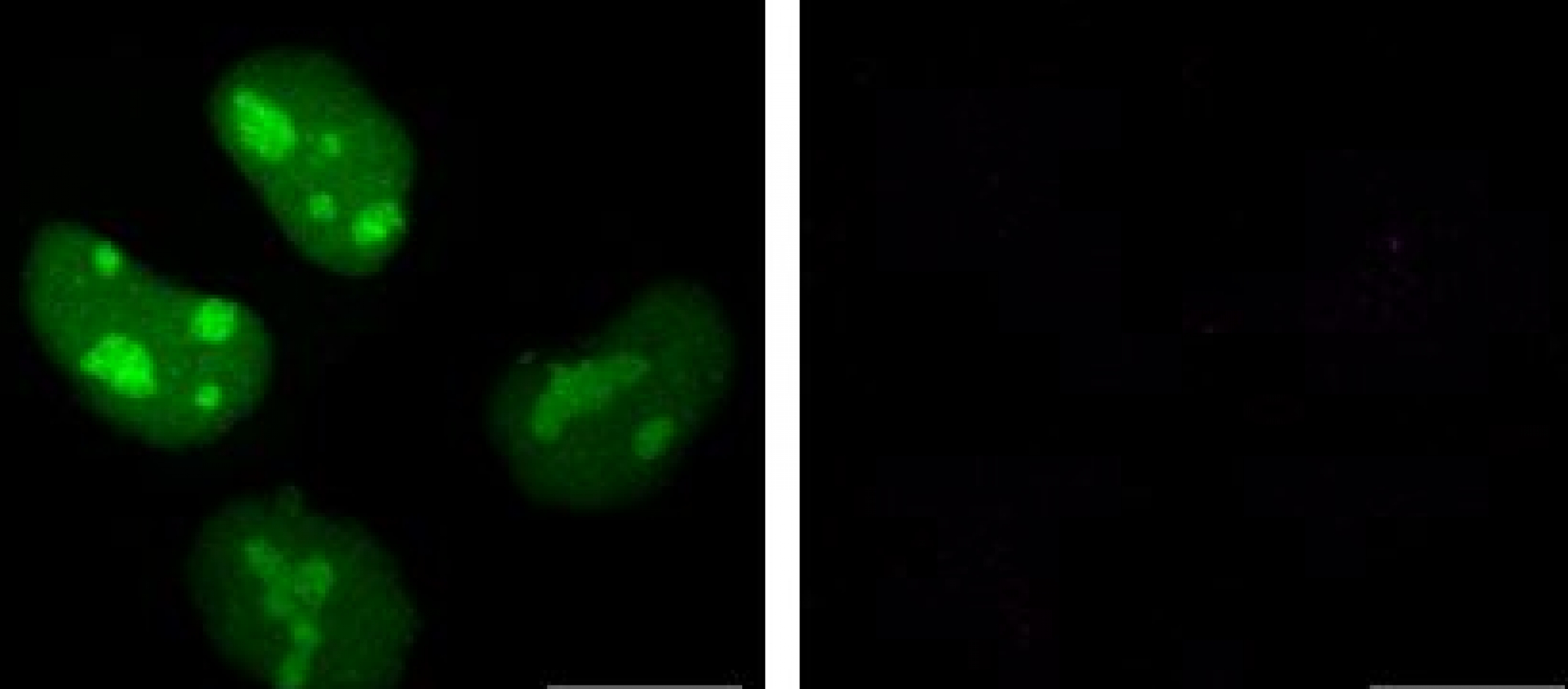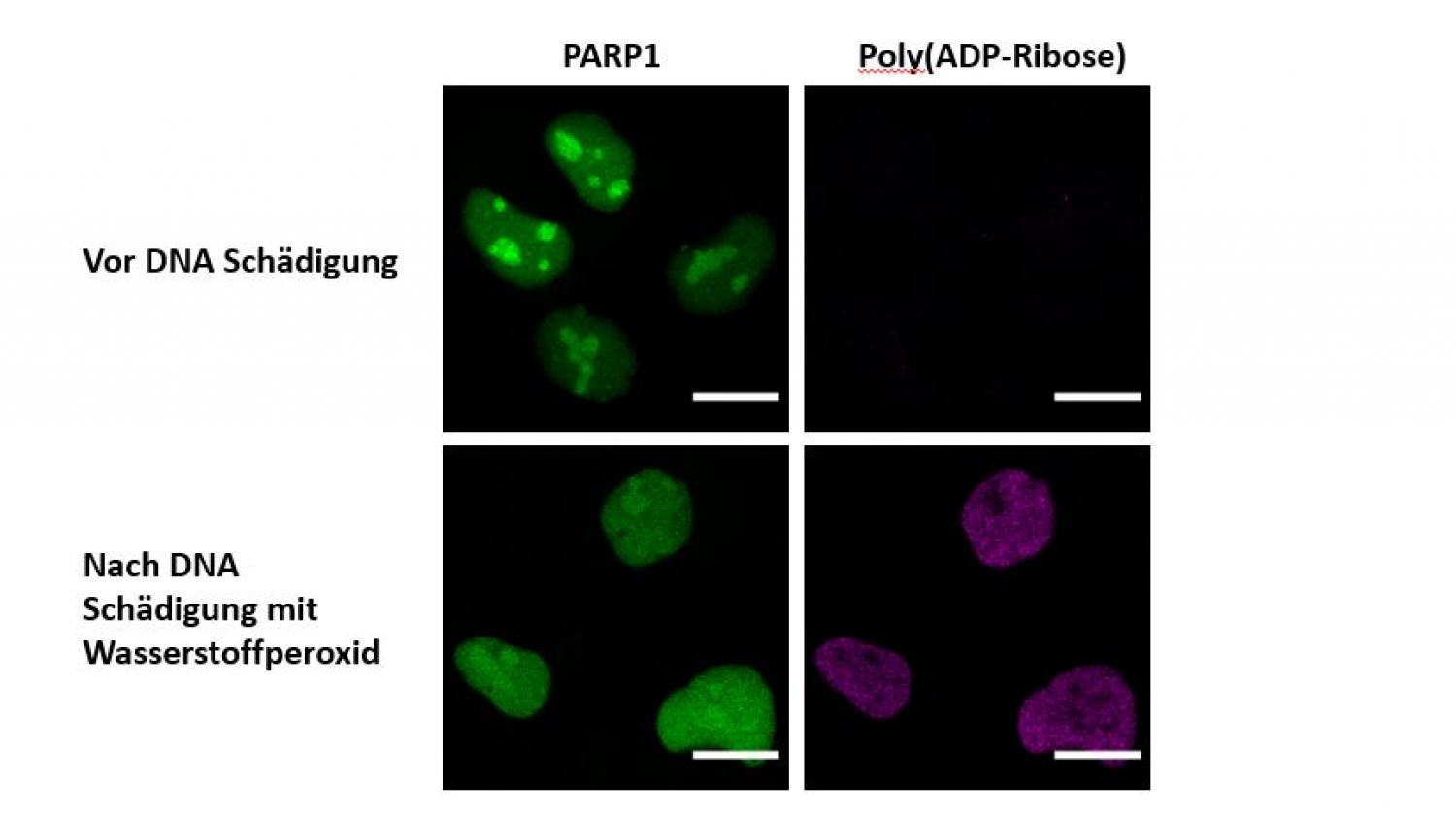 © Marina EngbrechtFluoreszenzmikroskopische Aufnahmen von Zellkernen einer menschlichen Krebszelllinie vor (oben) und nach DNA Schädigung durch Wasserstoffperoxid (unten). Links: Aufnahmen des DNA Reparaturproteins PARP1 (grün), welches eine räumliche Umverteilung im Zellkern nach DNA Schädigung zeigt. Rechts: Gezeigt ist das Syntheseprodukts der PARP1, das Biopolymer Poly(ADP-Ribose) (lila), welches durch aktivierte PARP1 Enzyme nach DNA Schädigung in den Zellkernen gebildet wird und an DNA Reparaturvorgängen beteiligt ist.