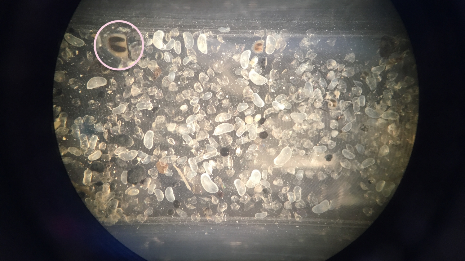 © Jana Isanta-NavarroEinblick in eine gewaschene Sedimentprobe aus der die Dauereier isoliert werden. Der Kreis markiert eines dieser Dauereier.