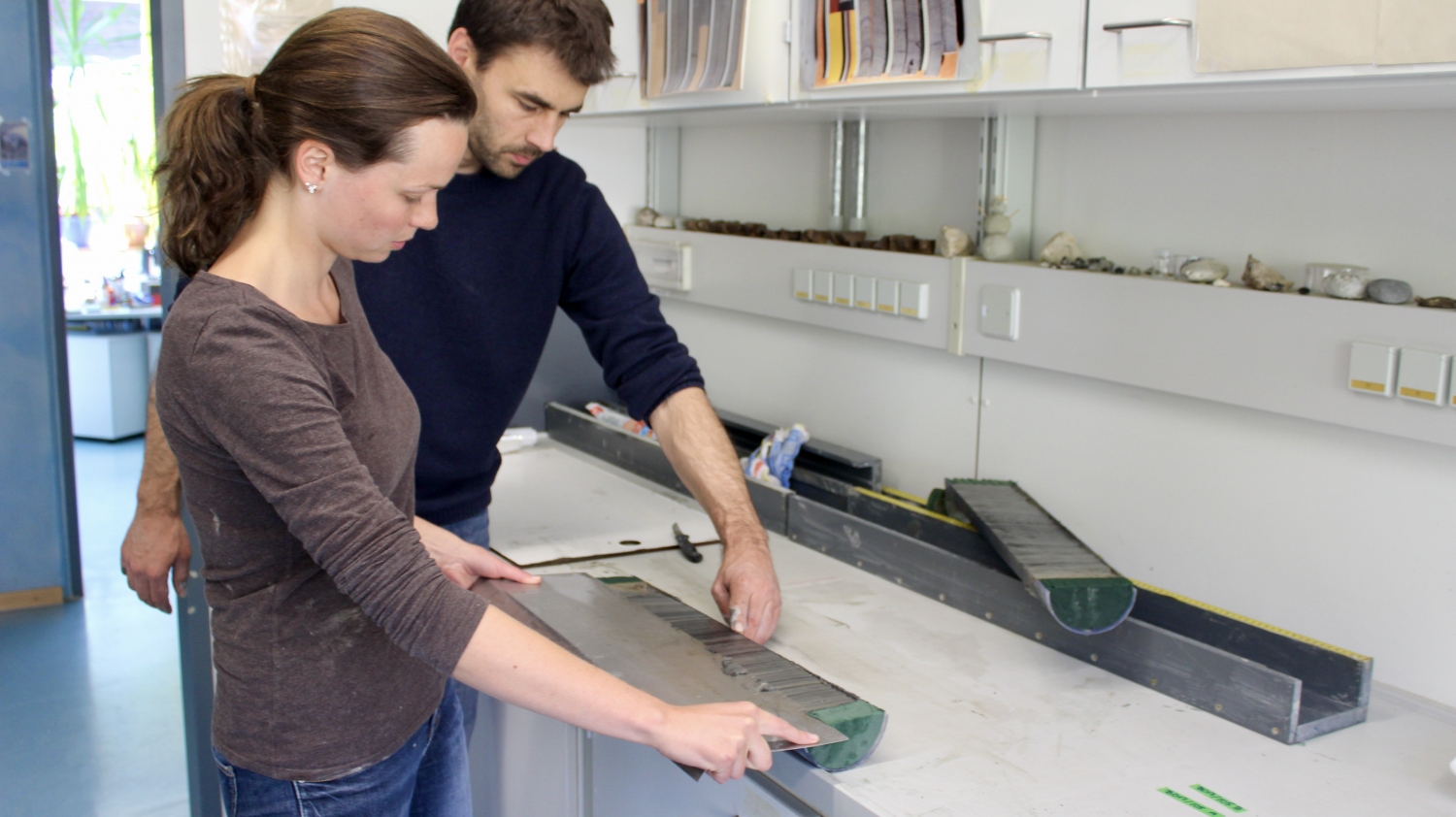 © Jana Isanta-Navarro und Markus MöstAufarbeitung der frisch gestochenen Sedimentkerne durch PD Dr. Dominik Martin-Creuzburg, Leiter der Arbeitsgruppe "Chemische Ökologie und Ökophysiologie" am Limnologischen Institut, und Dr. Jana Isanta-Navarro. Die Sedimentschichten einzelner Jahre sind anhand ihrer Farbe deutlich voneinander zu unterscheiden.