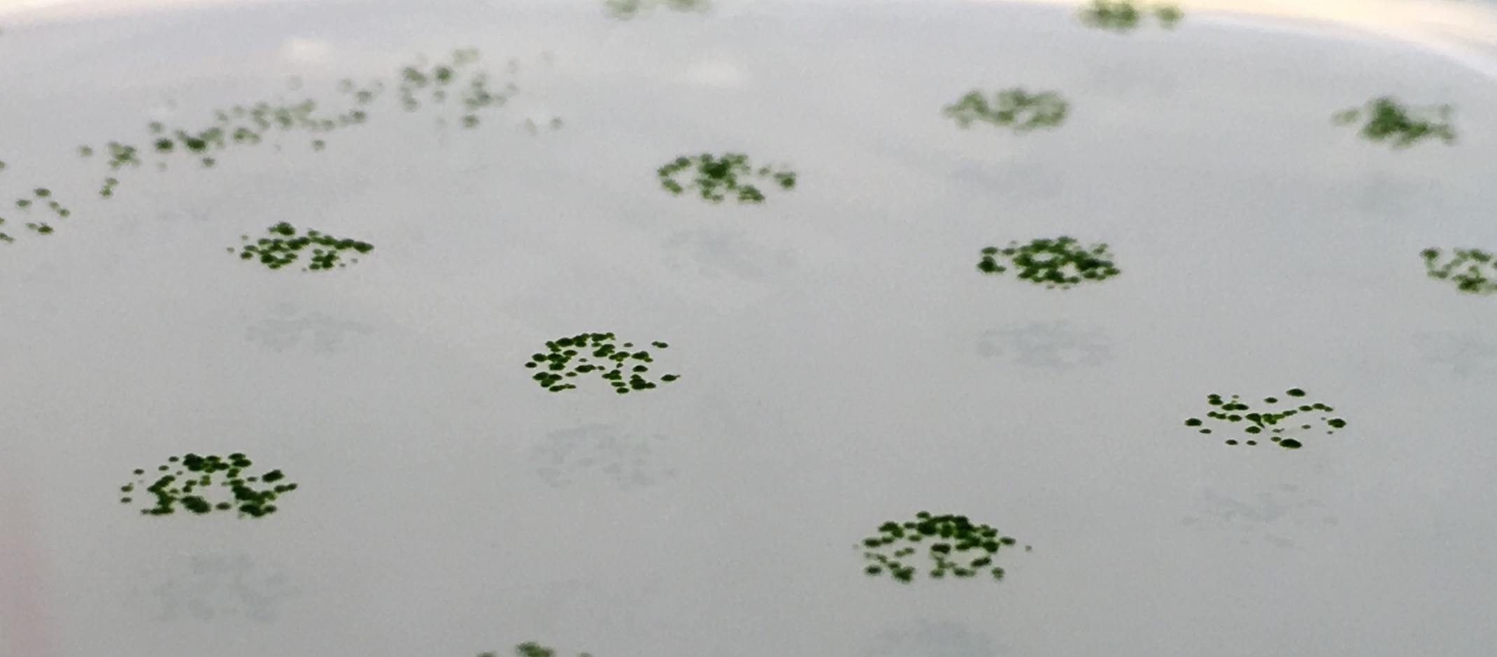 Bildunterschrift vom Hauptbild: Grünalge Chlamydomonas reinhardtii, die auf festem Medium wächst. Für die experimentelle Evolutionsstudie wurden 10 verschiedene Stämme von Chlamydomonas reinhardtii verwendet, die 6 Monate lang in Flüssigkulturen mit und ohne Räuber gewachsen sind, bevor sie auf evolutionäre Veränderungen getestet wurden.