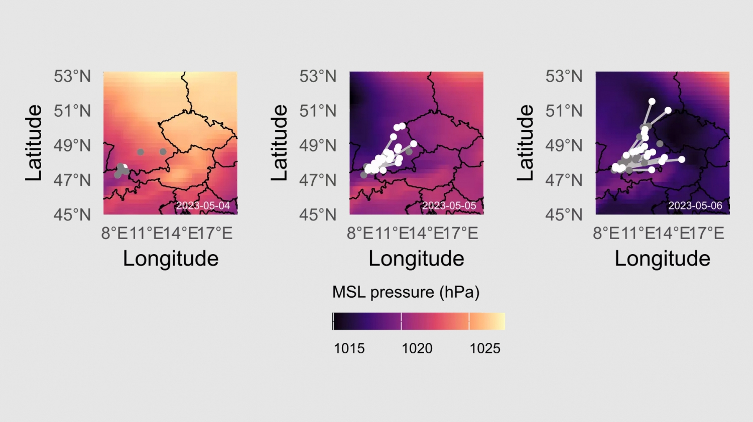 © Hurme et al. Science 2025Beispielhafte Darstellung der Fledermausflugbahnen über einen Zeitraum von drei Tagen. Es ist zu sehen, dass in einer Nacht mit sinkendem Luftdruck (Mitte) viele Tiere gleichzeitig abfliegen.