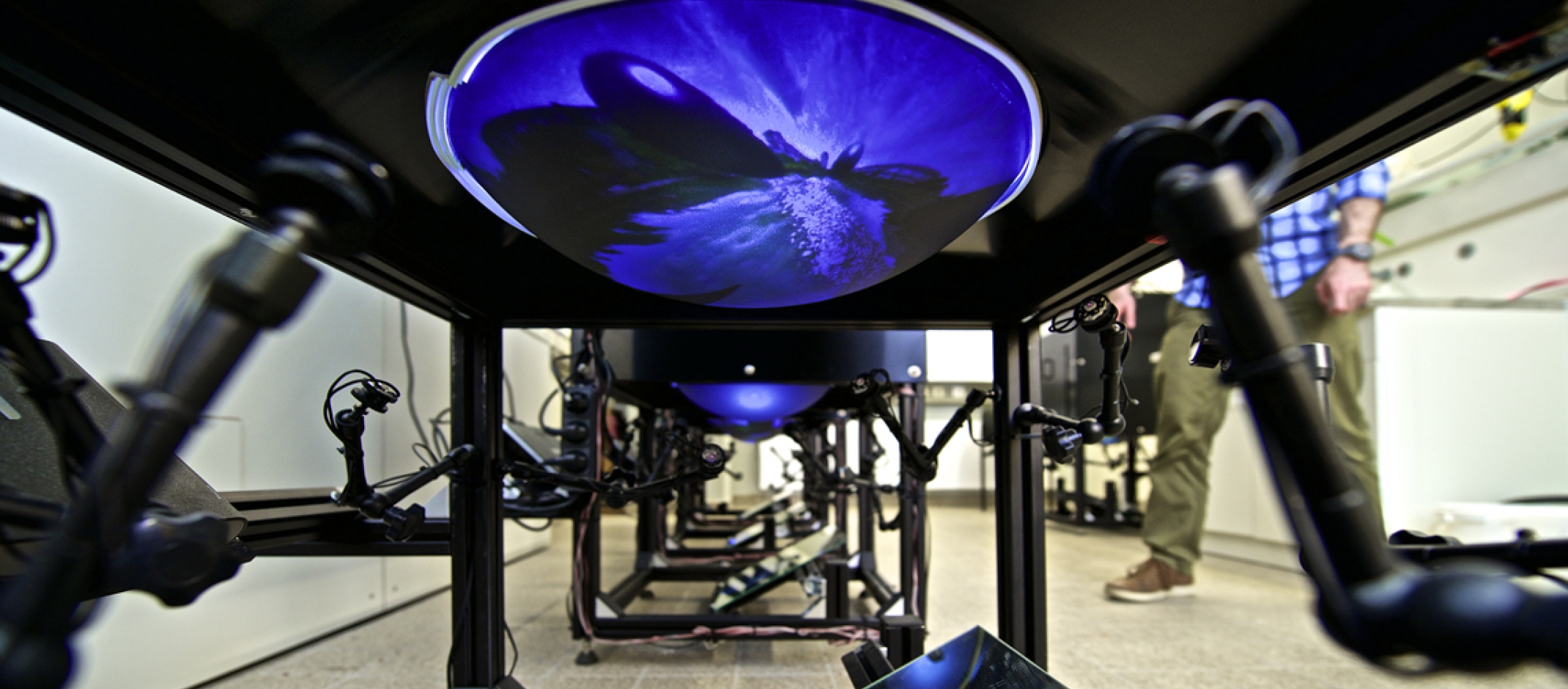 Work in Iain Couzin’s group and in other projects in the Cluster of Excellence "Centre for the Advanced Study of Collective Behaviour" employ bowl-shaped virtual reality systems for fish. Here, the movement of the freely moving fish is tracked by a multi-camera setup and the visualizations on the bowl, in this case 3D shapes, are displayed by projecting perspective corrected images from the bottom of the bowl. Image: lab of Andrew Straw, University of Freiburg.