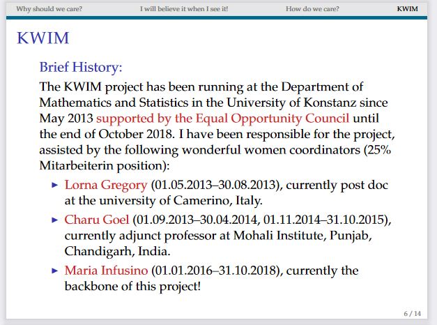 Ein Modellbeispiel von Salma Kuhlmann für die Rolle von Frauen in der mathematischen Forschung. Die Mathematikerin präsentierte 2017 im Rahmen der Ausstellung „Women of Mathematics throughout Europe. Gallery of Portraits“ in der Bibliothek der Universität Konstanz. Sie stellte die Initiative „Konstanz Women in Mathematics“ (KWIM) vor, durch die die Ausstellung über erfolgreiche Mathematikerinnen ermöglicht wurde. Das Referat für Gleichstellung, Familienförderung und Diversity der Universität Konstanz stellt seit 2013 Mittel zur Verfügung, um Frauen in der Mathematik auf ihrem Karriereweg zu Unterstützen.