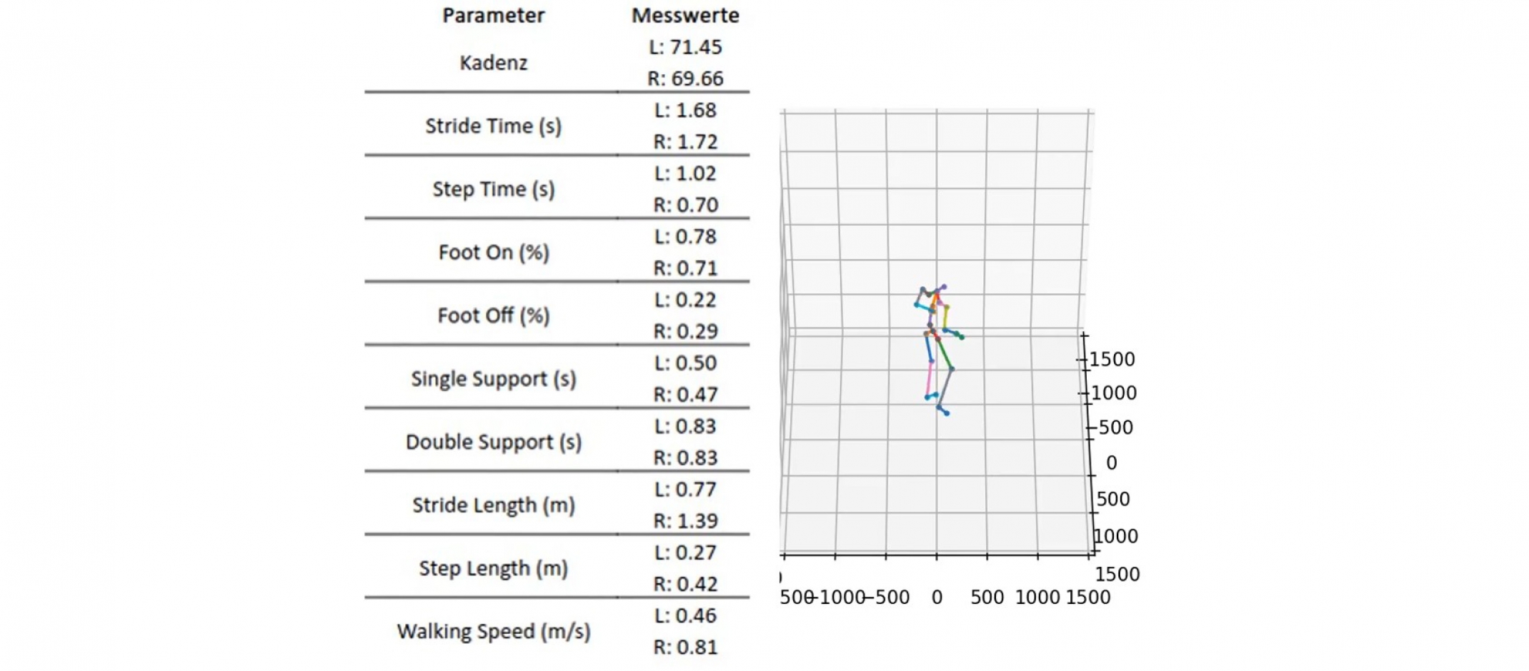 Headerbild: Beispielhafte Gangmessung mit den unterschiedlichen erhobenen Parametern (rechts das 3D-Skelett des gemessenen Probanden). Copyright: Subsequent GmbH