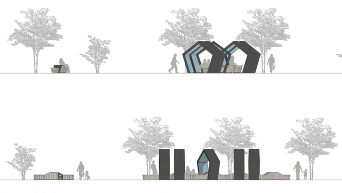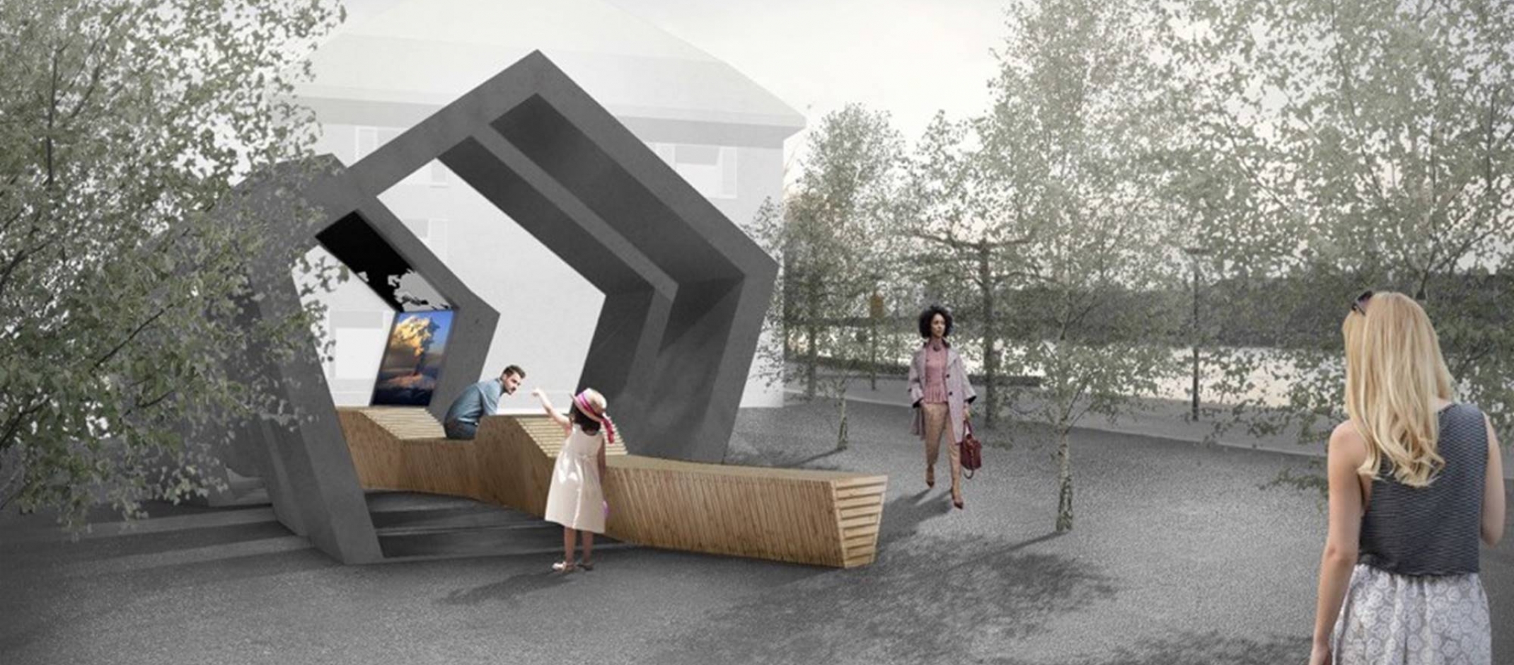 In den Fünfecken, die mit einigem Abstand zueinander angeordnet sind und dadurch gewollt Offenheit zulassen, sind Flatscreens und Interaktionselemente eingebaut, die wechselnde und aktuelle Themen und Inhalte aus dem Portfolio von Universität und HTWG zeigen. “Wir wollten einen Ort schaffen, der sich leicht in die Umgebung einfügt und der zum Verweilen einlädt”, erklärt das Team “5x5”. Besucherinnen und Besucher können sich auf der Bank ausruhen, je nach Standort die Natur, das Stadtleben oder die Aussicht genießen und sind dabei eingeladen, in Wissenschaft und Forschung einzutauchen. Wie tief, bleibt jedem selbst überlassen.
