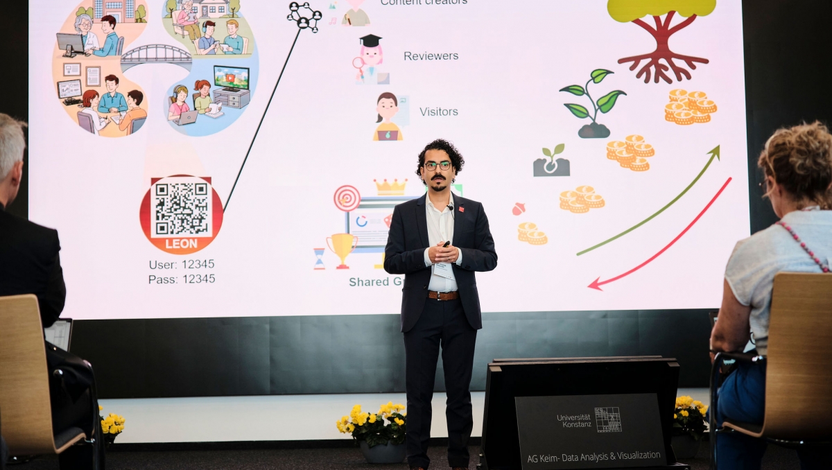 A lively panel discussion took place as the audience waited eagerly for the jury's decision. Giovanni Galizia, director the University of Konstanz's Zukunftskolleg, Tina Romer, managing director of the Konstanz Research School Chemical Biology, and journalist Matthias Kiechle, managing director of SK ONE, discussed how research topics can be communicated in a forward-looking manner. The participants emphasized that both research and media are key achievements of democracy that need to be protected and linked in useful ways. At the same time, they spoke about the challenges resulting from the rise of large online platforms that have their own agenda to retain users, which results in filter bubbles that hinder open, democratic discourse. This is how Matthias Kiechle described the current tension in science journalism: