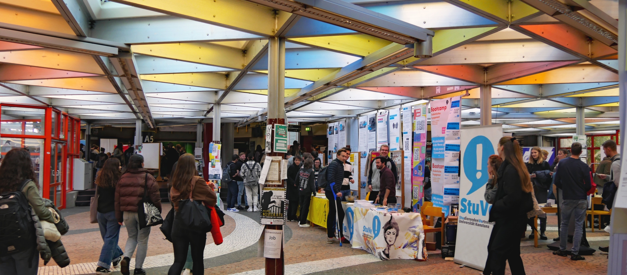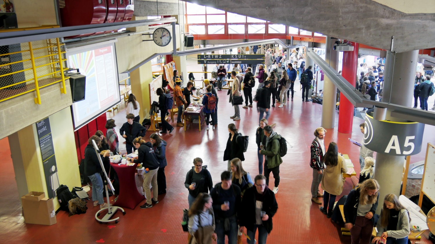Glühweinduft und der Geruch von Waffeln, dazu das Scheppern der getroffenen Ziele beim Dosenwerfen und ausgelassene Stimmung am Glücksrad. Wer am 8. November 2022 das Foyer der Universität Konstanz betrat, war plötzlich mittendrin im bunten Treiben am Tag des Engagements. An den ca. 20 Ständen der Hochschulgruppen und Fachschaften wurde geplaudert, gelacht und informiert. Die Gruppierungen stellten ihre Arbeit vor und interessierte Studierende konnten die vielfältigen Möglichkeiten der studentischen Beteiligung kennenlernen. Seit langem wurden im Foyer wieder so viele Stände aufgebaut, denn seit Beginn der Corona-Pandemie konnte keine Hochschulgruppenmesse in Präsenz stattfinden.