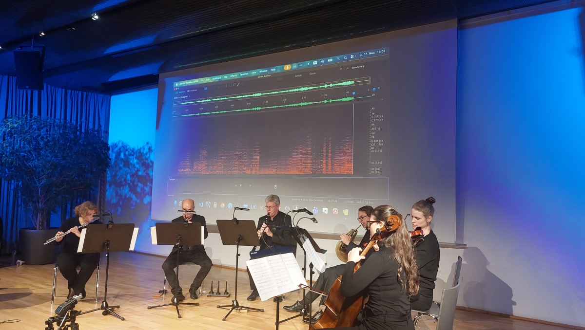 Es sei gar nicht so einfach, überhaupt einen einzelnen Ton von der KI zu bekommen, veranschaulicht Kiliani anhand verschiedener Anekdoten aus der Vorbereitung für den Vortrag. Letztlich sei es ihr aber gelungen und so stellt sie nun den KI-Ton dem einer realen Querflöte gegenüber. Schnell zeigt sich: KI klingt gut, aber letztlich viel zu gut und zu perfekt. Der Ton ist zu sauber und hat keine Zwischentöne, während man bei der live gespielten Querflöte sogar noch den Luftzug der Flötistin zu vernehmen meint. Das Spektrogramm bestätigt das Gefühl: Zwar stimmt das Grundbild überein, bei genauer Betrachtung aber erscheinen in der Abbildung des realen Tons mehr Zwischenfarben, mehr Obertöne, mehr Schwingungen.