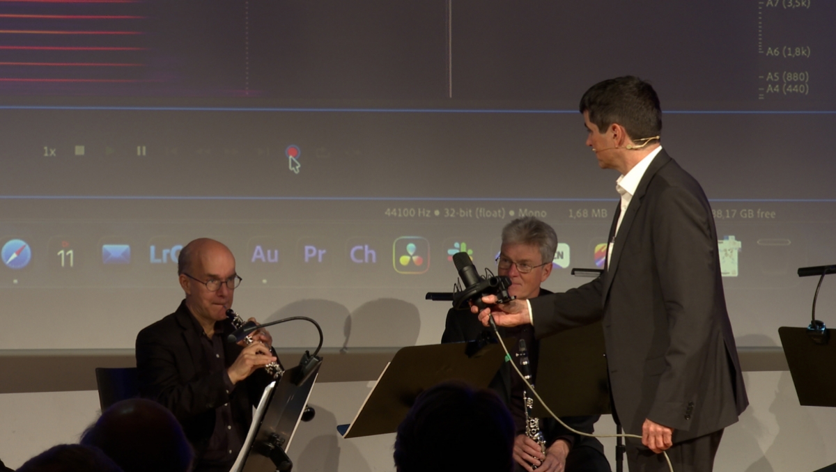 „Alle Instrumente haben einen Grundton, der gespielt wird. Die Violine hat zusätzlich aber ein sehr großes Spektrum an Obertönen, die weit über den Grundton hinausreichen“, erklärt Gönnenwein und zeigt das Ausmaß in der Grafik, die an die Wand projiziert ist. „Die Klarinette hat auch reichlich Obertöne, aber das Spektrum reicht längst nicht so weit, wie bei der Violine“, ergänzt er und zeigt auf das Abbild des Klarinettentons. Der Unterschied ist auch für Ungeübte leicht zu erkennen. Etwas schwerer wird es hingegen beim Vergleich zweier Blasinstrumente untereinander. Doch die beiden Forschenden führen das Publikum gekonnt durch das, was sie sehen und hören.