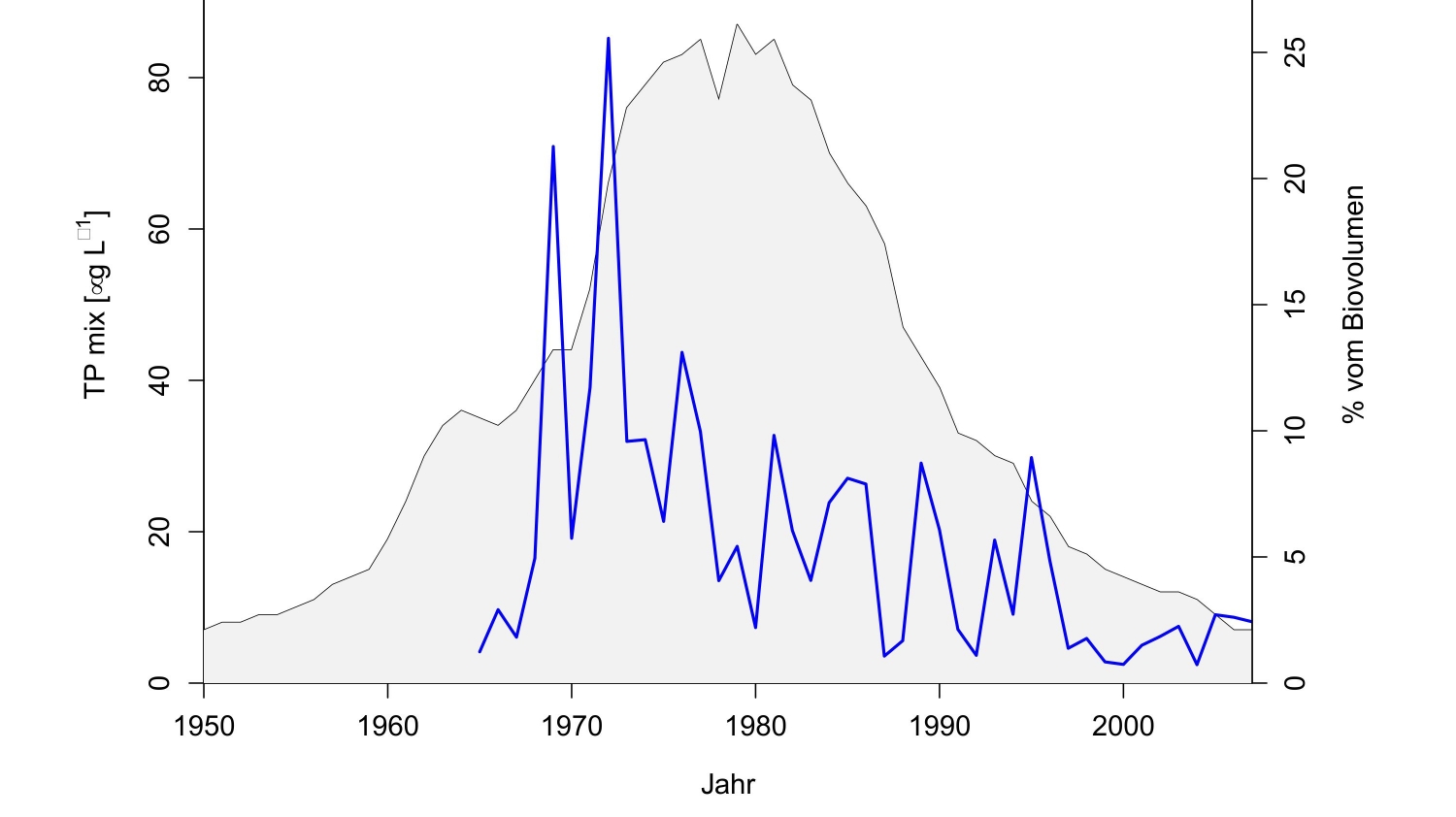 Veränderung des Posphorgehalts und der Blaualgendichte im Bodensee über die vergangenen Jahrzehnte. Die blaue Linie zeigt die Blaualgen.